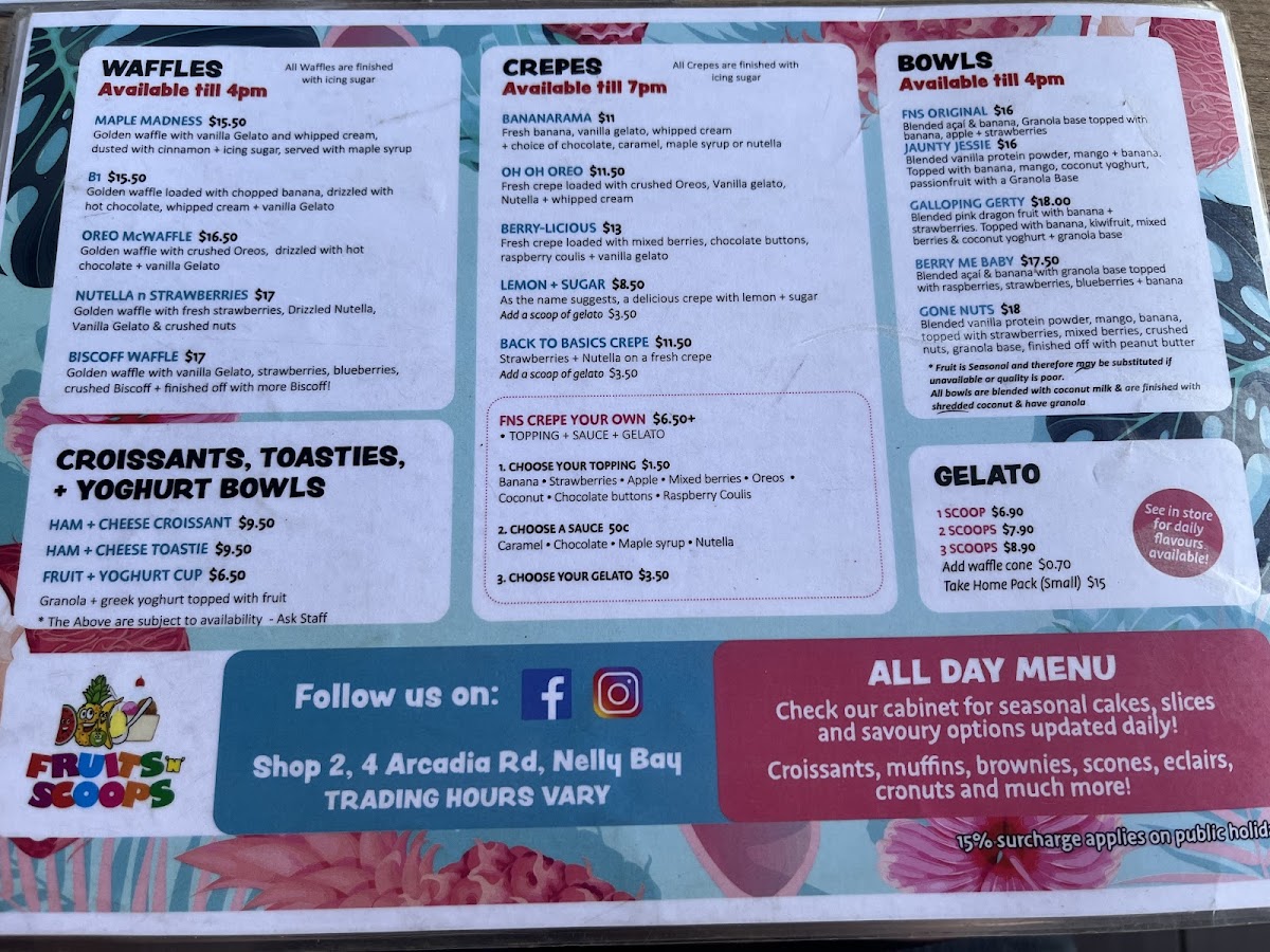 Welcome to Fruits N Scoops Pancake House, a delightful café nestled at 2/4 Arcadia Rd, Nelly Bay, Queensland. Known for its inviting atmosphere and friendly service, this spot is a must-visit for breakfast lovers. The menu offers an enticing variety of dishes, with pancakes taking center stage—customers rave about their fluffy textures and rich flavors. Highlights include the delectable Maple Madness and the heavenly Biscoff Waffle, ensuring a sweet experience for everyone.